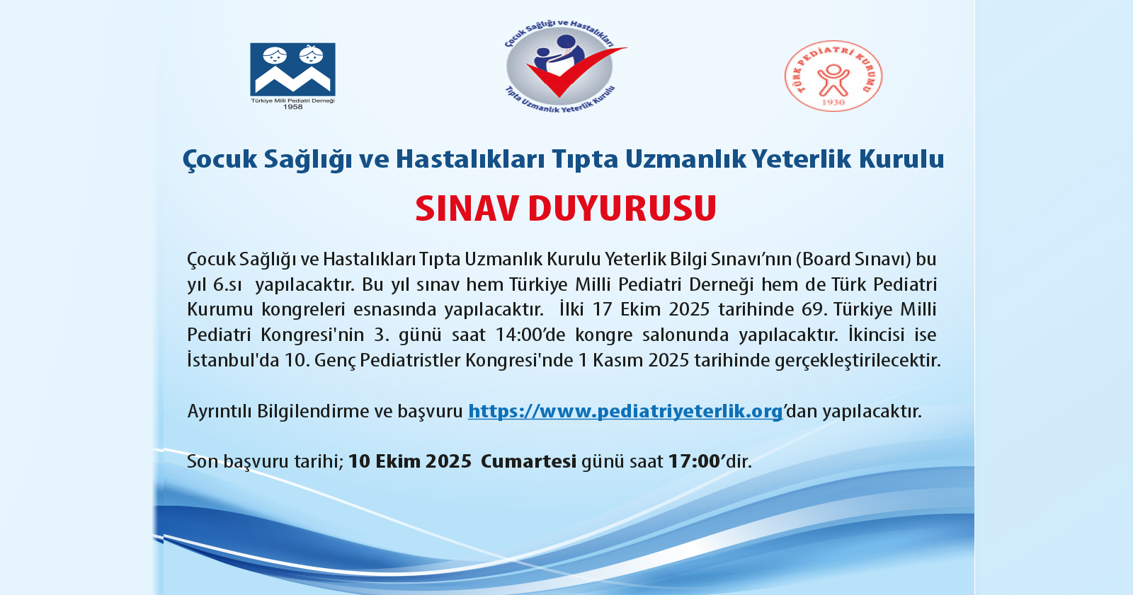 ÇOCUK SAĞLIĞI VE HASTALIKLARI TIPTA UZMANLIK KURULU YETERLİK 4.BECERİ/UYGULAMA SINAVI DUYURUSU